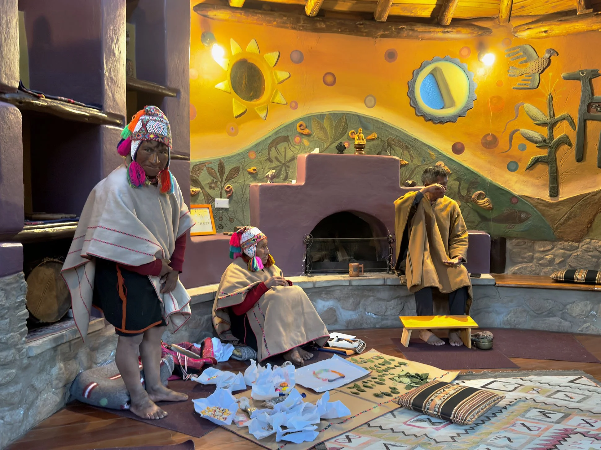 One of the highlights of the week was witnessing a “Despacho Ceremony” from two indigenous men from the Inca Highlands. We were able to do this since Silvario is trilingual and speaks Quechuan in addition to Spanish and English. Born in the Highlands at roughly 17,000 feet of elevation, indigenous Incan, Quechua-speaking people still live, off the grid, and off the land in the old way of life that has existed for centuries. Though Silvario was born there, he was encouraged to leave the highlands by his mother, who wanted him to have a broader life. He left at age twelve, to live in Cusco city, where he eventually learned Spanish and then English and has made his living as a guide for decades, beginning with guiding people on the four-day trek along the Incan trail to Machu Picchu. Silvario can be reached through his website here: https://www.banderitascusco.com